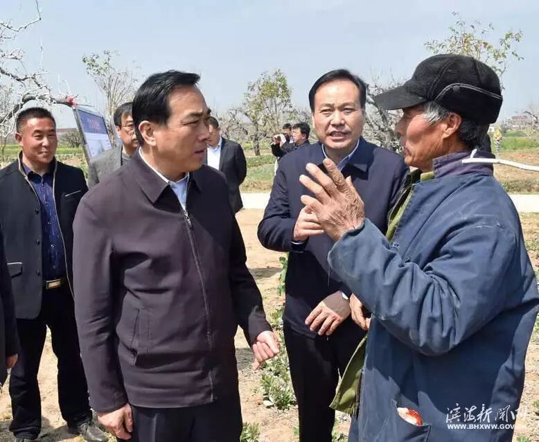 市委书记王荣平在县委书记钱武华的陪同下,在县农业园古梨园基地与村民就发展经济林果亲切交谈。 (金胜春 摄)